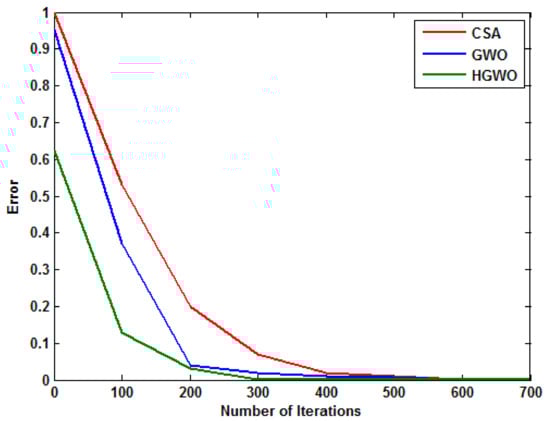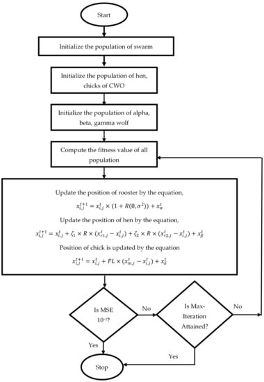| 1: Initialize the population of rooster, hen and chicks of CSO 2: Initialize the population of alpha, beta, delta wolves of GWO 3: Initialize r1, r2, FL, R(.), a 4: while (MSE = 10–5 || Max_iter = 700) 5: { 6: for all individual in population 7: { 8: do 9: Evaluate the fitness value of all swarm in the population 10: Update the position of , and wolves in the population is updated as 11: 12: 13: 14: Update position of rooster, hen and chick as, 15: 16: 17: 18: } 19: end for 20: } 21: end while 22: return the evaluated fitness value 23: return the iter_no 24: return MSE |