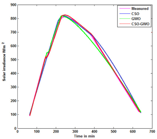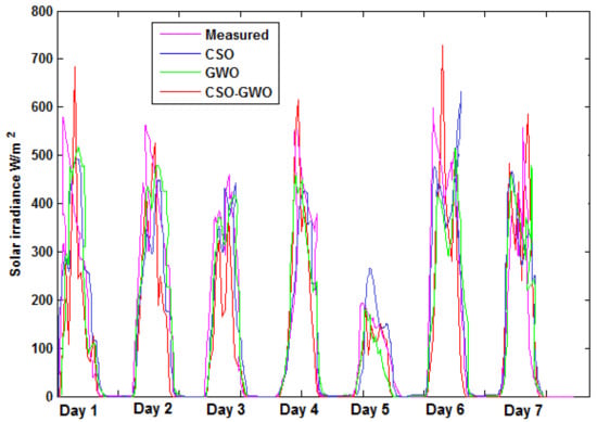 The LSTM is employed for single scale and multi scale solar irradiance forecasting. For individual time scale forecasting for hourly time scale, the obtained MSE is 0.3670 W/m2, the MAPE is 0.1249 and the DA is 0.1398 as in Table 2. In contrast, employing LSTM for multi time scale forecasting, the reported MSE is 0.2392 W/m2, the MAPE is 0.3562 and DA is 0.3189. For day ahead forecasting, the MSE, MAPE, and DA of multi time scale forecasting is 0.4326, 0.4652, and 0.4206, respectively. The same for individual time scale forecasting is 0.3468, 0.3135, and 0.3428, respectively. For week ahead forecasting, the performance metric values for multi time scale forecasting is 0.3456, 0.5521, and 0.5735, respectively, for MSE, MAPE, and DA. Similarly, for individual time scale forecasting, the reported metric results are 0.4021, 0.4350, and 0.2353, respectively. Here, it is observed that the performance of LSTM for multi time scale forecasting does not greatly deviate from individual time scale forecasting, whereas the impact of multi scale approximation is reflected in metric results as well. In Figure 8, daily solar radiation is predicted, showing that day 5 is cloudy, which shows that the error is less in the daily prediction curves in the proposed algorithm CSO, GWO, and hybrid CSO-GWO algorithm.
