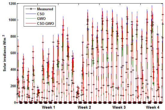 Weekly prediction of solar irradiance using CSO, GWO, and hybrid CSO-GWO with LSTM predictor for the weeks of December 2020.