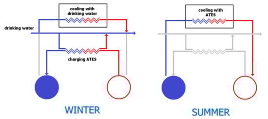 Cold drinking water in wintertime (left) is directly utilized in winter periods for places with extensive cooling requirements or is used for charging an aquifer thermal energy storage system (ATES) to provide space cooling in upcoming summer periods (right).