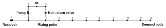 To determine the distance at which the temperature reaches soil temperature, the temperature change after the cold recovery unit was predicted using a temperature model [35]. The network configuration of the Sanquin full-scale system was used to build a hydraulic model (Figure 2) in EPANET 2.0, which is a free software package for water distribution network modeling [38]. In the Sanquin system, a portion of the drinking water coming from a 700 mm transport main is being bypassed through a 250 mm pipe towards the heat exchanger unit (HE). After cold recovery, water is being conveyed through a 250 mm pipe to the mixing point (point 4 in Figure 2), at which two water streams, one coming from the HE and the other one from the transport main, of different temperatures are mixed. Mixed water is being further transported to a water demand reservoir, which is located ~3850 m downstream of the mixing point (Figure S1 Supplementary Materials). Drinking water temperatures were measured using sensors, which were placed: before the bypass, after the heat exchange process, at the mixing point and before the demand point (point 12 in Figure 2).