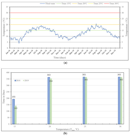 The daily temperature of the feed water (Tfeed water) in the years 2018–2019 is shown in Figure 3a. The average daily feed water temperature in the months of January–April was 8 ± 2 °C, in May–August and September–October the temperature remained between 16 ± 2 °C and 12 ± 2 °C, respectively, for both years. Overall, the temperature in the period January–August in the year 2019 was 1 °C higher compared to the year 2018. The average ΔT that can be achieved in specific periods in the year while recovering cold is summarized in Table 2. It ranged from 1.8 and 2.1 °C with a Tmax of 15 °C in the period May–Aug in 2018 and 2019, to 21.2 and 20.4 °C with a Tmax of 30 °C in the period January–April in 2018 and 2019.