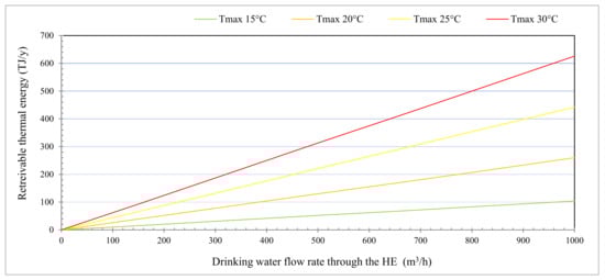 In addition, the climate change predictions, including more extreme weather conditions (higher temperatures in summer, leading to increase in surface water and soil temperatures and thus higher drinking water temperatures) in upcoming years [13], point at the fact that limiting the Tmax to 15 °C will not be sustainable both in terms of energy recovery and economics. In addition, the drinking water temperature within the transport mains is affected by the temperature of the subsurface soil, which in turn is influenced by increasing air temperatures [39,40]. With an increasing drinking water temperature, maintaining the Tmax at 15 °C will reduce the amount of retrievable energy. This increase in temperature stresses the need to set the maximum temperature limit for TED systems higher than 15 °C.