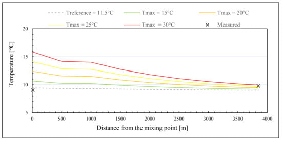 Because the HE unit at the Sanquin plant was operational only during winter days, temperature dynamics in the system were modeled using input parameters for a random winter day. Apart from the Tmax values (15, 20, 25 and 30 °C), also a reference case (Treference) was modeled. This is the water transport main of 700 mm without any HE unit or bypass and transporting water towards the same reservoir at ~3850 m downstream the Sanquin location. On the day that was used for the modeling purposes, Treference was measured to be 11.5 °C. Water flow in the 700 mm main varied between 840 and 940 m3/h, and the flow in the bypass was between 310 and 315 m3/h. A summary of additional input parameters can be found in the Supplementary Materials (Table S1 Supplementary Materials).