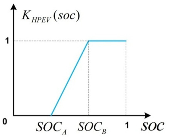 HPEV’s are a good alternative for uncontracted power demands. Figure 2 portrays HPEVs’ participation in idle mode. The value of gain KHPEV is a function of the State of Charge (SOC) [34]. HPEVs do not participate in frequency control when SOC is between SOCA and SOCB. The maximum and minimum output power reserve of HPEVs are marked by ΔP, and respectively [34].
