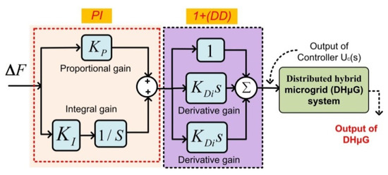 In this work, a novel proportional-integral with one plus double derivative PI − (1 + DD) controller is proposed and implemented to control and maintain the frequency of generated power supply at the time of unexpected load-generation changing condition. Utilization of only droop method is insufficient for advanced control purpose [37]. Thus, the secondary control loop is needed for better control of frequency fluctuation of the distributed power network. The architecture of the proposed PI − (1 + DD) utilized in this research work encloses two levels. The first level leverages proportional integral (PI) while the second level is constructed by double derivative controller as displayed in Figure 3. The controller is performed using the input error signal (ΔF). The formulation of PI − (1 + DD) controller with its transfer function modeling can be written as: