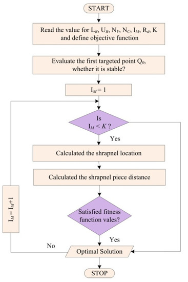 The MBA is a population-based optimization method based on the landmine explosion concept [28]. At the time of mine bomb explosion, a large number of shrapnel pieces spread at random distances. The casualties are calculated. The mine bomb explosion based casualties are treated as the fitness of the objective function at the mine bomb location. The flowchart of MBA is displayed in Figure 4. The variable upper and lower bound parameters (UB and LB) are selected. Initially, different considered parameters such as: designed variables (Nv), no of counts (NC), iteration number (IM) and reduction factor (Rd) are taken. Hence the first targeted point Q0 is given by [28]: