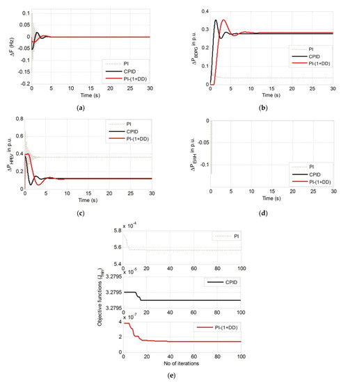 Comparison of the dynamic response of PI, CPID with the proposed (a) frequency deviation (ΔF), (b) power sharing of BDPG, (c) power sharing of HPEV, (d) power sharing of EWH and (e) objective functions (J).