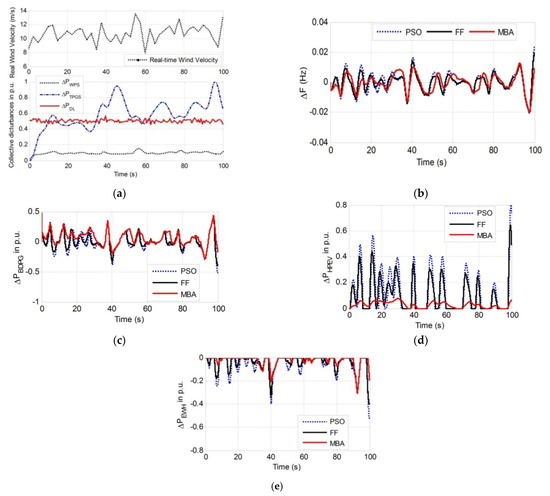 The comparative performance evaluation of the suggested algorithmic techniques is analysed in terms of frequency deviation and other subsystem output power in Figure 6b–e under real-time wind data and other collective random disturbances as depicted in Figure 6a. The real-time wind data and its corresponding change in wind power are plotted in Figure 6a. Three tools named PSO, FF and MBA are taken as an optimization technique of the unified frequency control model to find the best one. These optimization techniques have been performed individually and optimized the proposed best PI − (1 + DD) controller gains parameters. Table 3 lists the controller parameter values for different optimization techniques for Scenario 2. The system dynamic responses clearly demonstrated that MBA:{PI − (1 + DD)} technique is much better than PSO:{PI − (1 + DD)} and FF:{PI − (1 + DD)} techniques. It can be ascertained from Figure 6b that change in frequency subsides prolifically under MBA technique, ensuring the better stable response. Further, exploration under real-recorded weather data illustrates the competency of the suggested technique.
