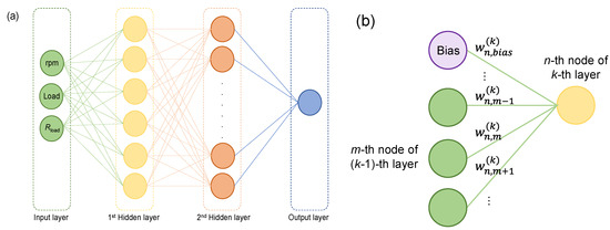 All the training datasets, including both the input and output datasets, were reorganized using the developed Python code to build the ANN according to the dimensions of the input and output variables (Figure 2a). The weight of each neuron formed between the nodes of two adjacent layers was also generated according to the number of nodes, whose range was predetermined before the training of the ANN (Figure 2b). All the nodes of the hidden layers and output layer had a bias correction value that was also normalized before the training and was updated during the training procedure.