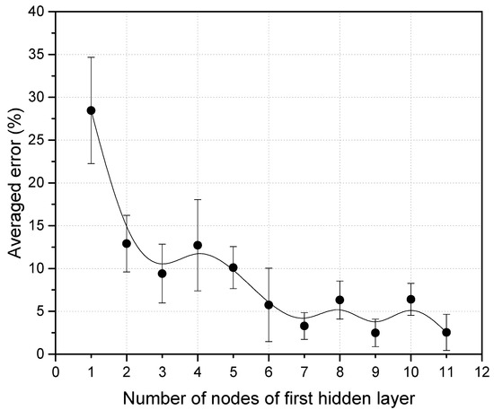 Averaged error between the experimental results and 3-layer ANN-trained results from 484 datasets obtained from eleven I–R experimental curves according to the variation in the number of nodes of hidden layers.