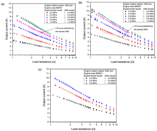 The prediction results obtained using the ANN exhibited certain trends. As shown in Figure 4, the ANN results are in good agreement with the I–R experimental curves. The maximum output power, shown in Figure 5, is obtained by multiplying half of the short circuit current with the corresponding load resistance. In this context, the difference between the experimental and ANN results would exhibit certain trends as well. When training datasets are used, the ANN would be trained better for some cases compared to the remaining at the beginning of the training. For the case of 1000 rpm, there is a high possibility that the ANN was trained better for the lower engine load conditions, compared to the higher engine load conditions at the beginning of training. As the ANN was trained further, the errors for all conditions would become smaller. When the error for the higher load conditions became small, thereby satisfying the convergence criterion, the lower load conditions would have a smaller percentage error. This could explain the trends in the percentage error. However, it is noteworthy that the increasing or decreasing trends in the error would be determined by the results of the initialization of weights. Thus, the variation in the trends among the different engine speed conditions would not have any physical meaning.