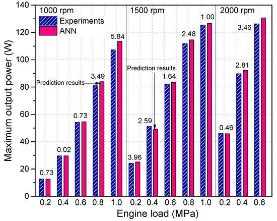 The prediction of the maximum output power is an important TEG research topic. The output power, defined as the product of the load resistance and the square of the corresponding output current, was determined using the trained and prediction results. Therefore, the value of the maximum output power for each operating condition was obtained from the I–R curves described in the previous section. Figure 5 shows the maximum output power obtained through experiments and ANN calculation for each experimental scenario. The results obtained using the two different methods were in good agreement from the perspective of the output power variation, according to the engine operating conditions. When the engine rotation speed was kept constant, the maximum output power tended to increase with the engine load. For similar engine load conditions, the increase in the engine rotation speeds resulted in an increase in the maximum output power. The number above each bar graph indicates the percentage difference between the experimental and ANN training/prediction results. A maximum difference between the experimental and ANN results of 5.84% was observed for the 1000 rpm–1.0 MPa scenario. The minimum difference between the experimental and ANN results was observed to be 0.02% for the 1000 rpm–0.4 MPa scenario.