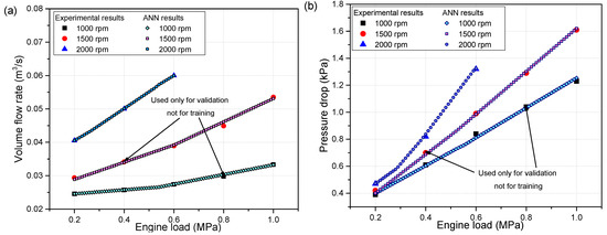 The pumping loss caused by the installation of the TEG in the middle of the exhaust tailpipe of the test engine can be obtained using the volume flow rate of the exhaust gas passing through the TEG and the pressure drop of the exhaust gas flow across the TEG. Therefore, the optimal ANN was also used to reproduce the fluid flow characteristics of the developed TEG. Because of relatively small datasets for the volumetric flow rate and pressure drop measurements, a higher convergence criterion—1% to 1.5% averaged error—was permitted to improve the training/prediction accuracy. As in the previous section, the two experimental datasets obtained at 1000 rpm–0.8 MPa and 1500 rpm–0.4 MPa were also used only for the validation but not for the training of the ANN. Therefore, three volumetric flow rate and pressure drop curves were produced for the three different engine rotation speeds as a function of the engine load. The averaged error between the experimental and ANN-trained results were 1.0% and 1.47% for the volumetric flow rate and pressure drop datasets, respectively. As shown in Figure 6a,b, the ANN could reproduce the two types of fluid flow characteristics curves without any noticeable overfitting and underfitting. This would be primarily attributed to the almost linear relationship between the two fluid flow characteristic variables—the volume flow rate and pressure drop—and the engine load. However, the effects both of the ANN structure and convergence criterion were also significant because overfitting and underfitting were more frequently observed when the numbers of nodes of hidden layers and convergence criterion were changed.