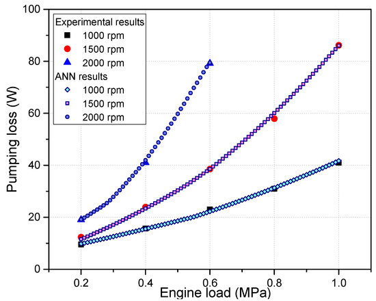 By combining the volume flow rate and pressure drop obtained in the previous section, the pumping loss of the TEG was acquired for the experimental and ANN results as a function of the engine load and rotation speed. As shown in Figure 7, the optimal ANN could reproduce the experimentally obtained pumping loss data and fill the gaps between the discretized experimental data without any noticeable overfitting and underfitting.