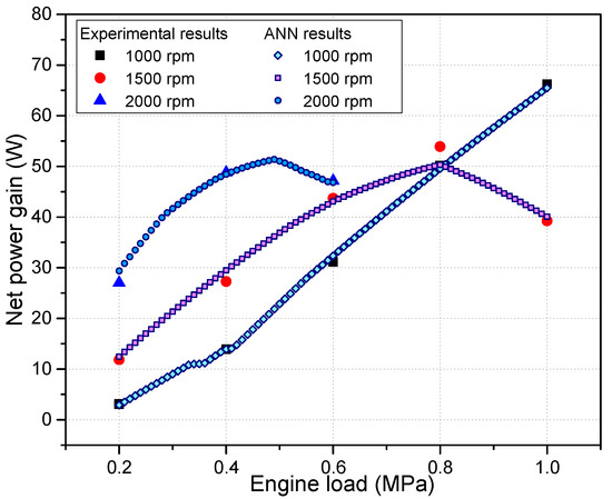 In contrast to the pumping loss, the rate of increase in the maximum output power became smaller because of the increase in the engine load when the engine rotation speed was equal to or larger than 1500 rpm (Figure 5). Thus, a peak point existed at which the net power gain had the largest value for the two engine rotation speeds of 1500 and 2000 rpm. For the 1500 rpm condition, both the experimental and ANN results indicated the engine load of 0.8 MPa as the point at which the maximum output gain could be obtained. While for the 2000 rpm condition, the optimal ANN indicated 0.5 MPa as the point at which the net power gain was maximum, which could not be obtained using discretized experimental results. For the 1000 rpm condition, the net output gain tended to consistently increase as the engine load increased. This was because the rate of increase in the maximum output power with respect to the engine load was larger than that of the pumping loss. Thus, the largest net power gain of ~65 W was observed for 1000 rpm–1.0 MPa BMEP.