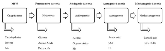 The organic waste disposed in landfills is mostly degrading under anaerobic conditions [44]. Soon after the waste is placed in the landfill, aerobic decomposition starts, as oxygen is consumed by the microbial biomass. The aerobic processes may continue until all oxygen present in pores and voids of the waste is consumed [44,45]. Degradation of organic mass by a group of anaerobic bacteria results in the production of CO2 and CH4 [46,47]. Methane gas is produced from decomposition of organic waste under anaerobic conditions mostly observed in landfills and large dumpsites [48]. A scheme of biochemical reactions during anaerobic digestion of organic fraction of MSW in landfill environment is illustrated in Figure 2.