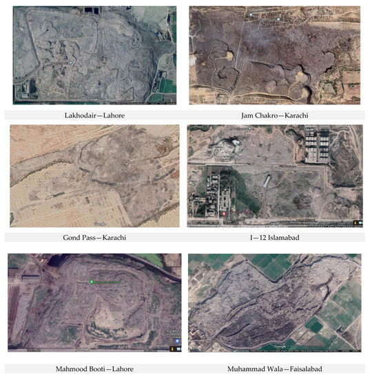 Hospital and industrial waste are also being dumped with MSW in landfill sites in some cities of Pakistan, creating serious environmental and public health concerns. In Pakistan, all available waste disposal methods (composting and landfills) are inadequate [73]. Even in the major cities of Pakistan like Karachi, Lahore, Islamabad, Faisalabad, and Peshawar there are no engineered landfill facilities for waste disposal. All existing landfills are just open dumpsites without any gas and leachate collection and treatment facilities [21]. These dump sites are breeding places for mosquitos, flies, animals, and birds, and have become the source of spreading diseases, odors, vegetation damage, groundwater pollution, and GHG emissions [60]. The open waste disposal conditions can be observed from aerial views of MSW disposal sites in some major cities in Pakistan in Figure 4.