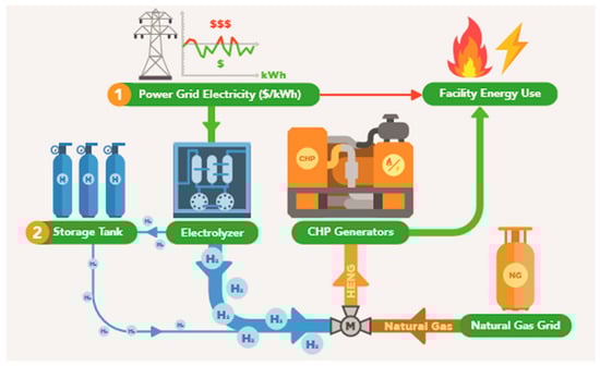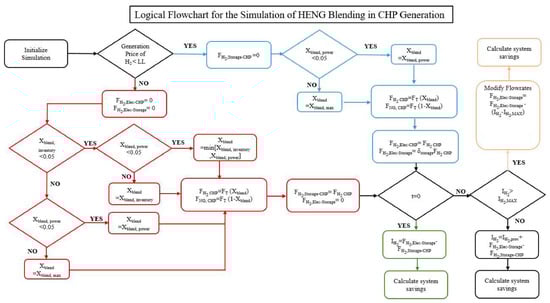 Based on the determined blending percentage, the new overall and individual gas flowrates sent to the CHP are calculated as shown in Equations (3) through (5). The total hydrogen production is the sum of the blended amount and the amount sent to storage.