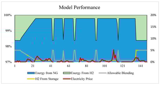 Figure 3) shows the resulting breakdown between energy generated by hydrogen and natural gas combustion, wherein the model continues to meet the total requirement for electricity and heating demand. While actual demand figures are shown only in percent form per the company’s request, the hydrogen blending as indicated by the grey line is effectively modulated between 0–5%. The model chooses to supply the full 5% when possible to achieve the maximum emissions offset and return on investment, except for when the energy requirement reaches 96.5% of the system’s maximum capacity. At this point, the hydrogen blending must be reduced in order to achieve the required output. The yellow portion of this line indicates when the model is calling for hydrogen to be released by the storage unit into the CHP. To demonstrate that the model is choosing these times effectively, the HOEP was overlaid to show this clearing corresponds to peaks in the local electricity price. As the amount of hydrogen blending increases, subsequently so does the total gas usage; however, there remains a net decrease in natural gas consumption of 1.6% over the two-week period (