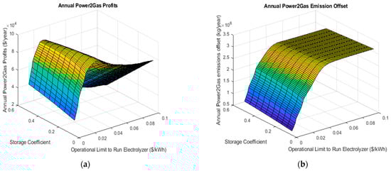 3 is set for the volumetric cost of purchasing natural gas. Applying emission factors for natural gas and for the electrical grid as listed by the Independent Electricity System Operator, the emission offset can be determined. While producing hydrogen will see an increase in electrical utility expenditure, it is also necessary to account for the increased consumption of water at the municipality’s industrial rate. Based on the emission and natural gas offsets, the system’s environmental and economic savings and expenses can be determined using the following formulae for any individual combination of production limit and storage parameters (Equations (6) and (7)).