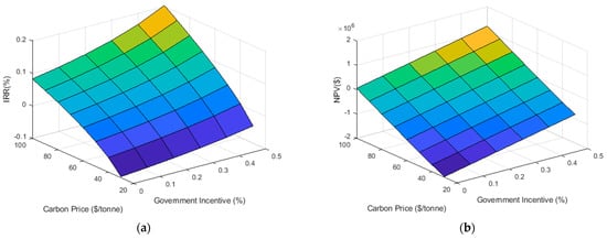 The simulation is implemented across an entire year for each combination of generation price limit and storage coefficient. The result is a surface plot that shows the impact of storage coefficient and generation limit on the annual profit and emission offset of the proposed installation. For each parameter setting in the simulation, the maximum required hydrogen production rate and the maximum required tank storage capacity can be determined and used to estimate the system’s capital and operating costs. Using this information, the net present value (NPV) and internal rate of return (IRR) for each scenario can be determined, and the optimal configuration can be selected for a fixed carbon price and capital grant incentive.