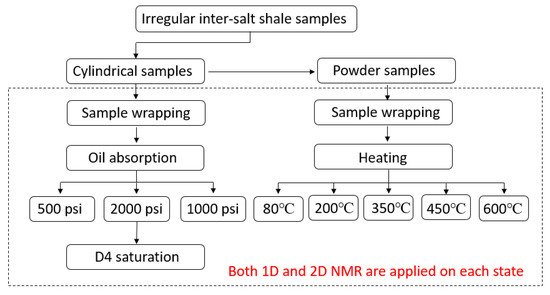 The objective of the current study was to investigate the distribution model of fluid components and movable oil in inter-salt shale. If the inter-salt shale contacts free water during the experiment, it leads to the dissolution of soluble salt minerals and causes pore dilation. Therefore, there should be no water in the whole experiment. Design of experiments (DoE) is a systematic approach to evaluate parameter sensitivity, quantify uncertainty, and perform optimizations in many oil and gas industrial applications [48,49], but the experimental procedure in this paper does not necessary to follow the DoE workflow because the major relevant parameters were fixed. Two series of experiments were designed and carried out based on different types of samples. Figure 1 shows the flow chart of the experimental procedure.
