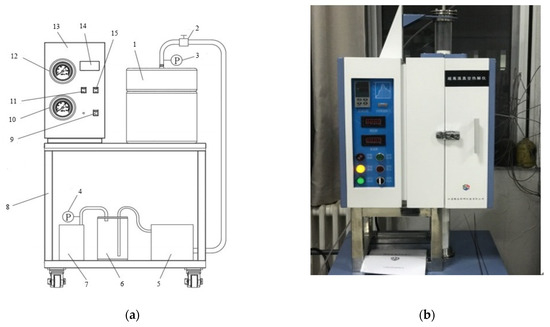 The particularly designed stepwise multi-temperature anaerobic heating equipment. (a) Schematic diagram of the equipment. 1—pyrolysis chamber, 2—exhaust valve, 3—the first pressure sensor, 4—the second pressure sensor, 5—condenser, 6—collecting tube, 7—suction filter pump, 8—supporting platform, 9—main power switch, 10—suction pressure indicator, 11—heating switch, 12—pressure indicator in the kettle, 13—power control box, 14—temperature control meter, 15—pumping switch. (b) The real developed equipment.