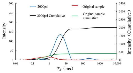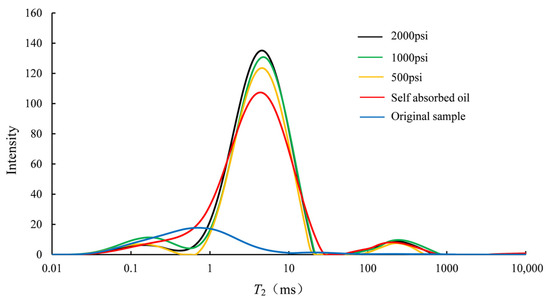 At the very beginning of the study, the inter-salt shale samples were dry rock samples, and most of the free moveable oil in the samples (i.e., part S1-1 in the pyrolysis analysis) had been lost. Hence, the distribution pattern of the free moveable oil could not be directly obtained from the sample’s original-state NMR measurements. By comparing the changes of 1D T2 spectrums (Figure 3) and 2D T1-T2 maps (Figure 4) of samples before saturation and after saturation under different pressures, the distribution pattern of free oil in the inter-salt shale could be acquired.