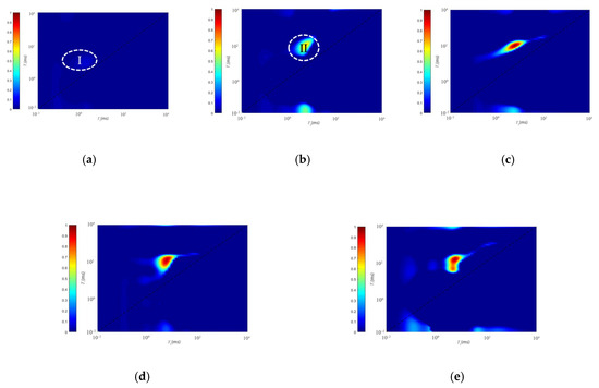 Multi-saturation state 2D T1-T2 maps for the cylindrical inter-salt shale sample ZY1-1. (a) Original state, (b) self-absorbed oil state, (c–e) saturated oil under pressures of 500, 1000, and 2000 psi, respectively.