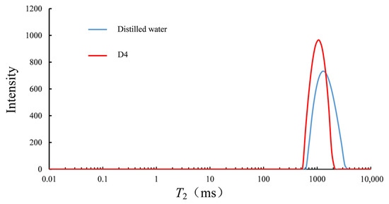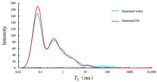 The inter-salt shale rock contains water-soluble salt minerals; therefore, it is impossible to study the distribution of water in the inter-salt shale by the method of water saturation. The existing literature has found the hydrophilic fluid octamethylcyclotetrasiloxane to resemble water [54]. In this research, in order to determine the similarity of the NMR response of octamethylcyclotetrasiloxane and water in shale pores, a shale sample was saturated with water and octamethylcyclotetrasiloxane separately, and the results were compared as shown in Figure 5 and Figure 6.