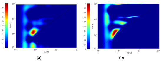 T1-T2 maps of shale at different states. (a) Saturated with water, (b) saturated with D4.