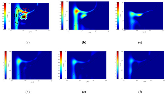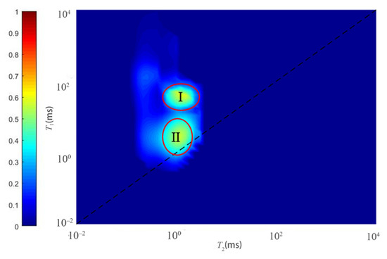 In this study, the 1D and 2D NMR spectra of six samples before and after saturation with D4 were analyzed. After saturation with D4, there were two obvious highlighted areas in the T1-T2 maps, namely areas I and II (Figure 8). Among them, the distribution of area I was the same as that in Figure 4a (T1: 4~30 ms; T2: 0.5~4 ms), which was the part remaining in the rock sample, and finally, the area was regarded as free residual oil. Region II was the NMR signal obtained after the shale was saturated with D4, so this region was regarded as the distribution range of water.