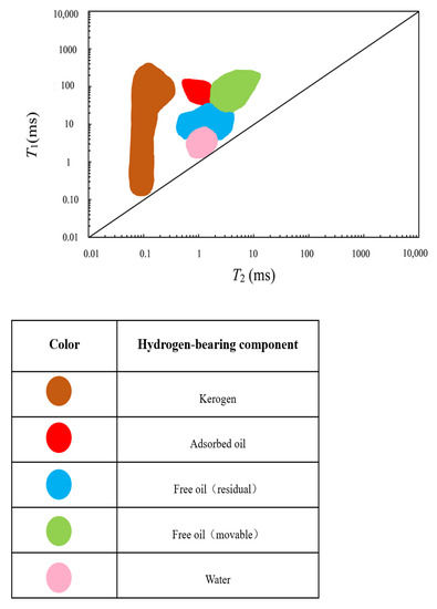 where ħ is the Planck constant, γI and γS are the gyromagnetic ratios of nuclei, r is the spin distance, τc is the molecular rotation-related time, and ω0 is the resonance frequency. According to the BPP model, organic matters have long T1 values and short T2 values. Therefore, it is feasible to separate the detected signals of free oil and other hydrogen-bearing components through the T1-T2 map.