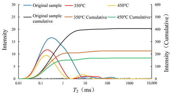 Because the experimental sample was shale, the kerogen signal could be counted as the pore signal, so in the subsequent calculation of the saturation of various fluid components, the kerogen signal (i.e., after heating at 450 °C) was removed as the background signal.