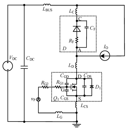As shown in Figure 1, a double pulse schematic circuit with parasitic parameters as studied is exhibited [19,25]. According to its features, the circuit can also be applied to research the switching process of other topologies, such as the Buck circuit, Boost circuit, and so on. The definitions of the physical quantities in the circuit are as follows. VDC is the input source, IO is the output or load current. Q1 is the SiC MOSFET to be studied. vp is the driving source. The parasitic parameters of Q1 include CGS, CDS, CGD and RG1. CGS, CDS and CGD are the parasitic equivalent capacitors of the gate-source, drain-source, and gate-drain junction, respectively. RG1 is the internal driving resistor. LCS is the common-source inductor. LG is the parasitic equivalent inductor of the gate. LD, LBUS and LC are the parasitic equivalent inductor of the different branches where they are located, including the circuit and PCB layout lines. RG2 is the external driving resistor. D is the freewheeling diode, and a SiC junction barrier Schottky (JBS) diode is adopted here. The parasitic parameters of D include RF and CF, i.e., the on-resistor and the junction capacitor, respectively.