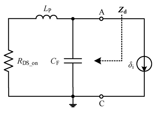 Stage 3. Drain-source voltage fall time. When considering the common source inductor, the operating state of stage 3 can be equivalent to the topology exhibited in Figure 4. The channel of the SiC MOSFET will be fully turned on at this stage, and the drain current will resonate under the influence of the diode junction capacitance CF and the parasitic inductor LP. The drain current resonance frequency is shown in Equation (8). The high-frequency resonant drain current causes the common source voltage to oscillate seriously, and the severely oscillated common source voltage may easily cause reverse charging of the drive circuit. The drain-source voltage at this stage can be expressed by Equation (9). According to the expression of the drain-source voltage at this stage, it can be known that the reverse charging of the driving circuit will suppress the drop of the drain-source voltage, and even cause Q1 to be turned off in error.