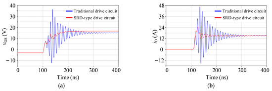 When the SRD-type drive circuit is adopted in the test circuit, the gate-source voltage of Q1 has no obvious oscillation, and the maximum voltage spike of the gate voltage of Q1 is 16.8 V, which is within the safe range of the gate-source voltage. Since gate-source voltage oscillations of Q1 are effectively suppressed, drain current and drain-source voltage oscillations of Q1 are also effectively suppressed. When the SRD-type drive circuit is adopted, the drain-source voltage spike of Q1 is reduced by 186 V, and the drain current spike is reduced by 22 A. The drive circuit based on the proposed SRD-type drive circuit works stably at a high turn-on speed, and the turn-on loss of Q1 is significantly reduced.