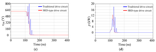 The turn-on waveforms based on different drive circuits: (a) waveforms of gate-source voltage vGS, (b) waveforms of drain-current iD, (c) waveforms of drain-source voltage vDS, and (d) waveforms of turn-on loss p.