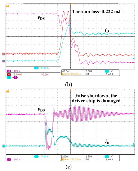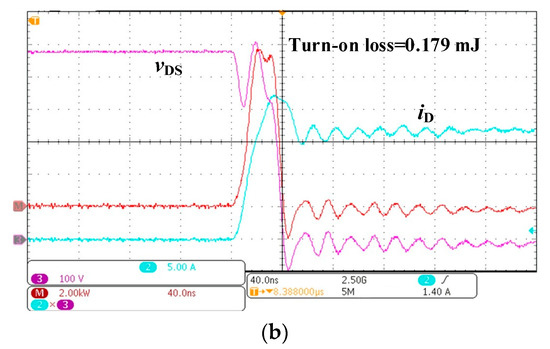 Figure 9 shows the turn-on waveform of the double-pulse circuit, based on the SRD-type drive circuit. The turn-on waveform indicates that SiC MOSFET can work reliably based on the SRD-type drive circuit with a 1.5 Ω external resistor. For the purpose of reducing the turn-on loss furtherly, a 0 Ω gate resistor is used in the SRD-type drive circuit during the turn-on process of the device. The experimental waveform is shown in Figure 9b. The experimental results show that when the 0 Ω gate resistor is applied to the SRD-type drive circuit, SiC MOSFET can be turned on normally. When the SRD-type drive circuit uses a 0 Ω gate resistor, the turn-on loss of the SiC MOSFET is reduced to 0.179 mJ. Compared with the use of a 10 Ω external resistor, the turn-on loss of the SiC MOSFET is reduced by one-third.