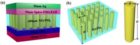 Figure 1a schematically shows the overall structure of the PSC, which consists of Ag metal electrode, Spiro-OMeTAD hole transport layer, perovskite absorption layer with two-dimensional photonic crystal structure, dense TiO2 electron transport layer, and FTO conductive glass. Figure 1b shows the absorption layer with photonic crystal structure and the specific structure of single scattering element, where H is the height of the scatterer, R is the diameter of the scatterer, and L is the lattice constant.