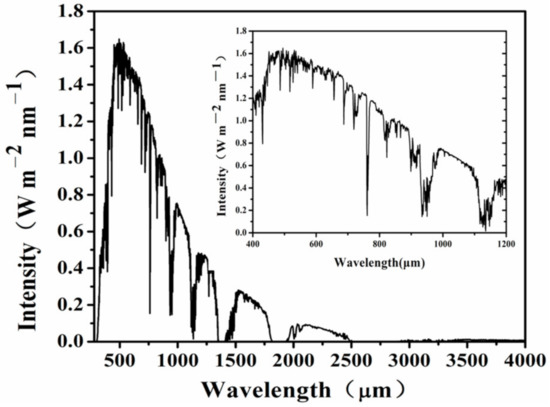 It is well known that the wavelength distribution range of sunlight is 0–4000 nm. According to AM1.5G standard solar spectral data [31], the solar radiation energy map is depicted in Figure 3. It can be found that the solar radiation intensity is strongest in the wavelength range of 400–800 nm, which is roughly the range of visible light [32]. In the near-infrared range, the solar radiation energy accounts for 54.3% of the total radiation energy in the wavelength range of 400–800 nm, while in the range of 800–1200 nm, the light radiation energy only accounts for 24.7%. Therefore, in the process of light absorption, the wavelength absorption in the range of 400–800 nm should be prioritized, and the wavelength absorption in the near-infrared range should be the auxiliary.