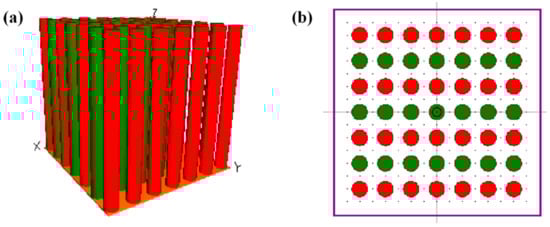 In this paper, we use the DiffractMOD module to design a two-dimensional perovskite photonic crystal absorption layer, as shown in Figure 5. Figure 5a is the stereoscopic view of the absorption layer, while Figure 5b is the top view of the absorption layer structure. In the stereoscopic view, the red and green cylinders are the scatterers of the photonic crystal structure, and the yellow thin layer area at the bottom is the irradiation range of the incident light, corresponding to the purple frame of the top view. The blank area is filled with MAPbI3 perovskite, as shown in Figure 5b.