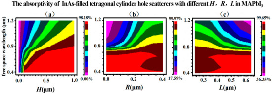Firstly, the influence of the variable H on the absorption efficiency of the absorption layer was studied. Therefore, R and L were randomly taken as values of 0.3 μm and 0.5 μm, respectively. The simulated image is shown in Figure 6a. Figure 6a shows the absorptivity of InAs-filled tetragonal cylinder hole scatterers with different H in MAPbI3. The absorption efficiency increases with the increasing scatterer height H. However, the thicker the layer is, the longer the migration distance of photogenerated carriers becomes in the absorption layer, leading to the increment of carrier recombination probability and the decrease in external quantum efficiency (EQE), which is not conducive to the improvement of photoelectric conversion efficiency. In order to analyze the relationship between the height of scatterer H and the absorption efficiency in details, the absorption of incident light in the wavelength range of 400–800 nm by the absorption layer with different H was calculated through the integration of Figure 6a, as shown in Table 1. When H > 0.6 μm, the increase in absorption efficiency tends to be stable. Taking all facts into consideration, the best value of the scatterer height as H = 0.6 μm is chosen.