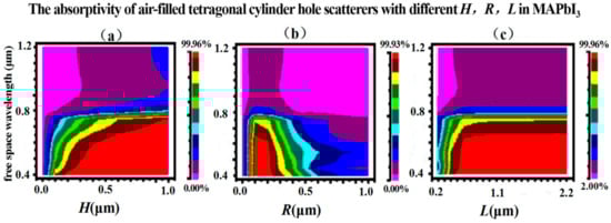 Absorptivity of air-filled tetragonal cylinder hole scatterers in MAPbI3, result of a simulation with the DiffractMOD module in the Rsoft software. Each graph presents the individual effect of morphological parameter (a) H, (b) R, and (c) L.