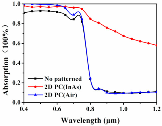In order to compare with the absorption layer with photonic crystal structure, the absorption efficiency of the pure MAPbI3 perovskite absorption layer with the same thickness was measured. Figure 8 shows the absorption efficiencies of different absorption layers measured in the wavelength range of 400–1200 nm by the simulation. It can be seen that compared with the pure MAPbI3 perovskite absorption layer, the absorption layer with photonic crystal structure has the higher absorption efficiency for incident light. In addition, the absorption efficiency of the 2D photonic crystal with InAs is higher than that of air.