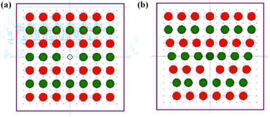 It should be noted here that the absorption efficiency of the InAs cylindrical scatterer absorption layer presented in Figure 8 is based on a perfect photonic crystal structure. In fact, this is an ideal state. Crystal defects, such as point defects, line defects, and so on, are inevitable in the process of photonic crystal fabrication, causing some errors in the absorption efficiency of the absorption layer. In order to make the data more scientific and precise, the absorption efficiency of the photonic crystal absorption layer with two kinds of crystal defects is simulated in this paper, and the corresponding error bars are proposed. Figure 9 is a schematic diagram of the photonic crystal structure absorption layer with two kinds of crystal defects. Figure 9a shows the absorption layer of photonic crystal structure with point defects, while Figure 9b shows the absorption layer of photonic crystal structure with line defects.