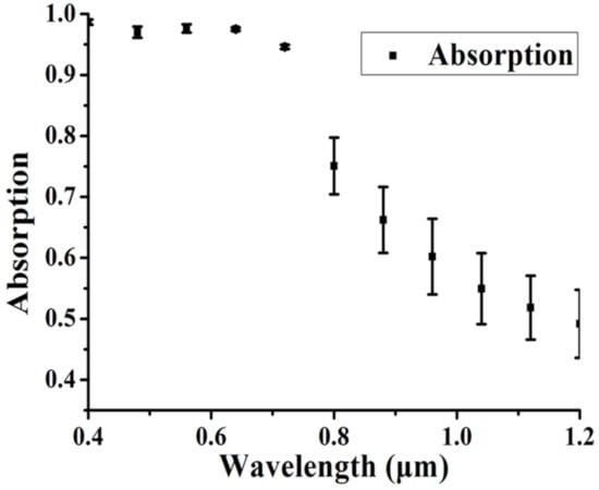 The absorption efficiency of the absorption layer with two kinds of defect structures obtained by simulation is shown in Figure 10. According to Figure 10, the error caused by the defect structure for the absorption efficiency of short-wavelength incident light was small, while the error for the absorption efficiency of long-wavelength incident light was large.