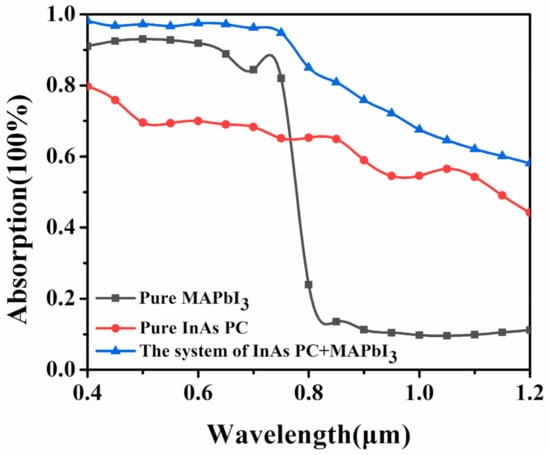 The absorptivity of pure MAPbI3 perovskite, pure InAs PC structure, and the composite system of InAs PC + MAPbI3.