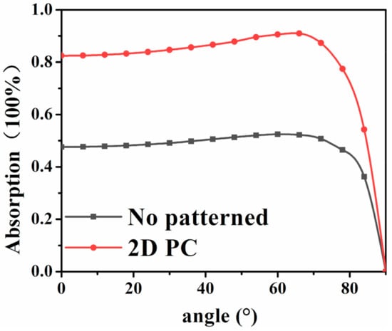 In addition, the dependency of the absorbing layer on the angle of incident light is analyzed when the height of the scatterer H, the diameter of the scatterer R, and the lattice constant L are optimized. When the incident light angle changes, the cosine loss will inevitably occur on the surface of the battery [33], resulting in the reduction of photoelectric conversion efficiency. Through the introduction of photonic crystal structure and the use of its “slow light” and band gap effect, the interaction between incident light and absorptive layer material is increased, leading to the improved absorption efficiency, and thus the compensated cosine loss caused by the angle change of incident light. In this study, the effect of light incident angle on the absorption efficiency of the absorption layer was simulated in the range of 0–90°. As shown in Figure 12, compared with the absorption layer without photonic crystal structure, the absorption efficiency of the absorption layer containing photonic crystal structure is about 80% in the incident light angle range of 0–80°, which proves that the absorption layer with photonic crystal structure is robust to the incident light angle.